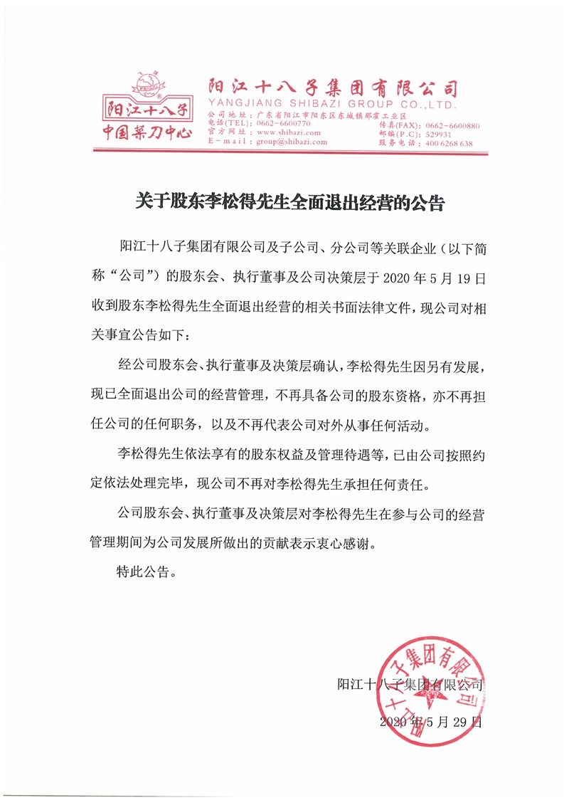 關(guān)于股東李松得先生全面退出經(jīng)營的公告