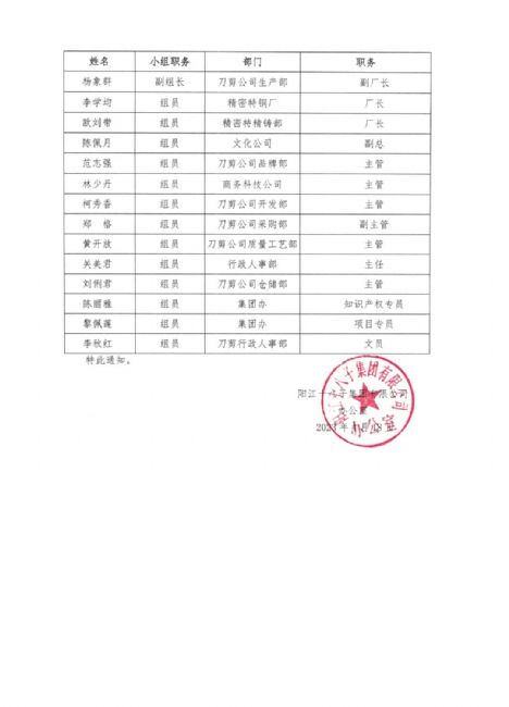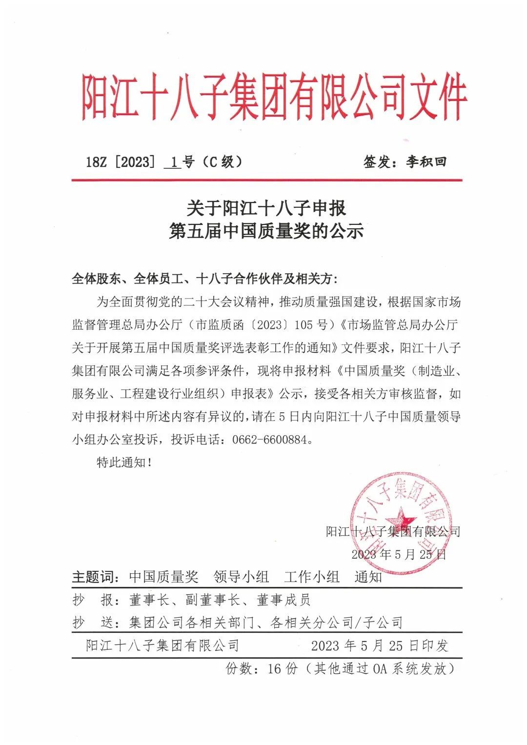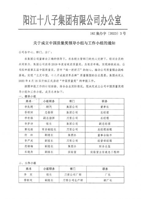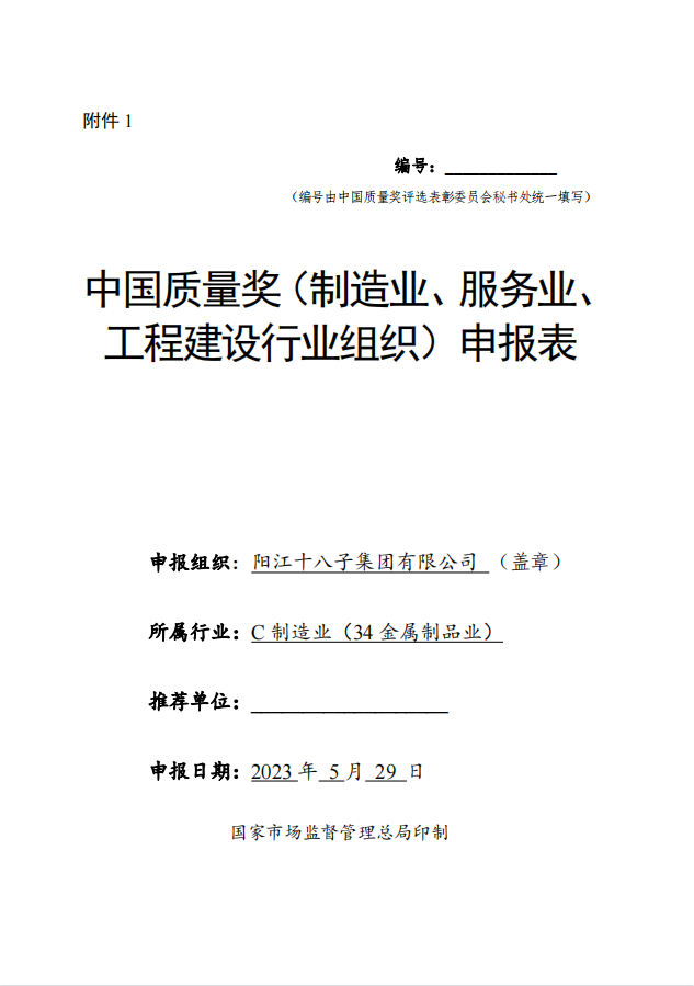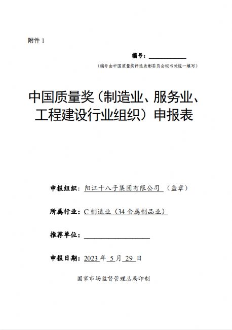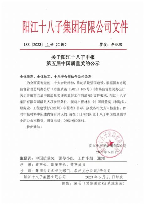 為貫徹黨的二十大會議精神,推動質(zhì)量強國建設,根據(jù)國家市場監(jiān)督管理總局辦公廳(市監(jiān)質(zhì)函【2023】105號)《市場監(jiān)管總局辦公廳關于開展第五屆中國質(zhì)量獎評選表彰工作的通知》文件要求,陽江十八子集團有限公司滿足各項參評條件,現(xiàn)將申報材料《中國質(zhì)量獎(制造業(yè)、服務業(yè)、工程建設行業(yè)組織)申報表》公示,接受各相關方審核監(jiān)督,如對申報材料中所述內(nèi)容有異議的,請在5日內(nèi)向陽江十八子中國質(zhì)量領導小組辦公室投訴,投訴電話:0662-6600884。